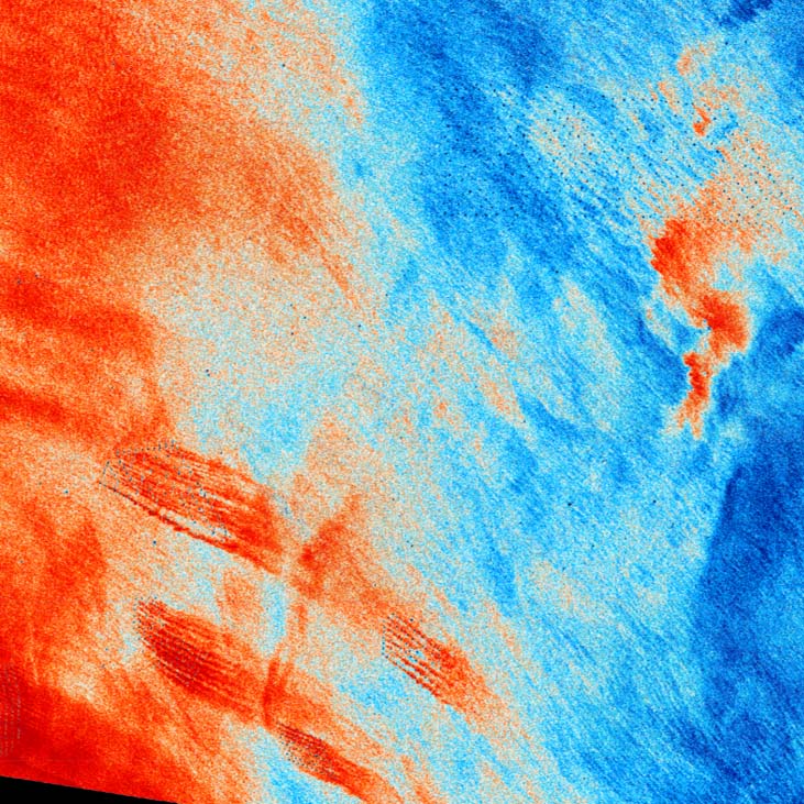 As countries transition to low carbon economies, the rate of offshore structure installation and removal is rapidly accelerating. Anthropogenic structures in marine environments have a profound effect on ecosystem processes. We’re developing algorithms to identify offshore structures, chart them, and quantify the contribution they make to ocean sprawl. This image shows ocean surface roughness (red is rough, blue is smooth) derived from synthetic-aperture radar, it shows ‘plumes’ of increased surface turbulence from offshore wind farms.